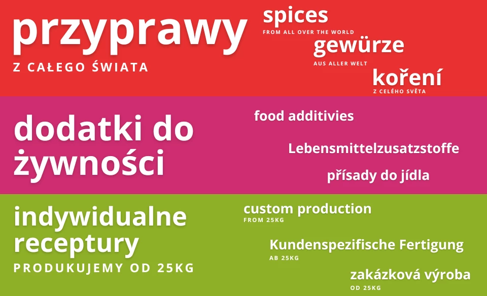 Wir beliefern polnische und ausländische Unternehmen, die Gewürze über den E-Commerce-Kanal verkaufen. Unsere Kunden schätzen wiederholbare Qualität, systematisch erscheinende neue Produkte und innovative Produkte. Kunden aus der E-Commerce-Branche bestellen am häufigsten unsere Mischungen mit getrockneten Tomaten, Vanille und homogenen Gewürzen in großen Mengen. Beim Online-Handel lohnt es sich, auf natürliche Gewürzmischungen ohne "E"-Zusätze zu setzen.