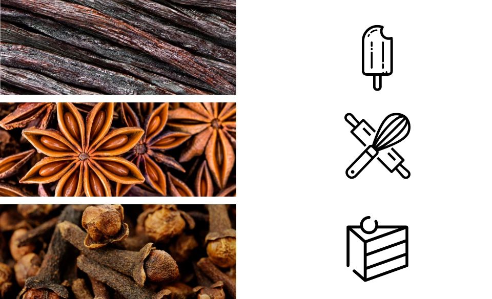 Vanille und Gewürze sind aus Backwaren und Speiseeis nicht mehr wegzudenken. Darüber hinaus kaufen die Kunden in dieser Branche häufig Sesam, getrocknete Zitronen- und Orangenschalen. Auch Chili als Zusatz zu Schokoladendesserts ist in dieser Branche ein begehrtes Gewürz geworden.
