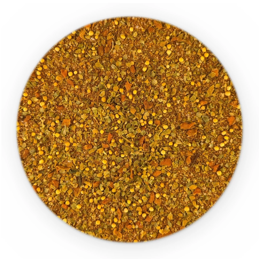 sól, papryka słodka, chilli, gorczyca biała, czosnek granulowany, cukier, marchew, majeranek, zioła prowansalskie (oregano, bazylia, tymianek, cząber, estragon, rozmaryn).