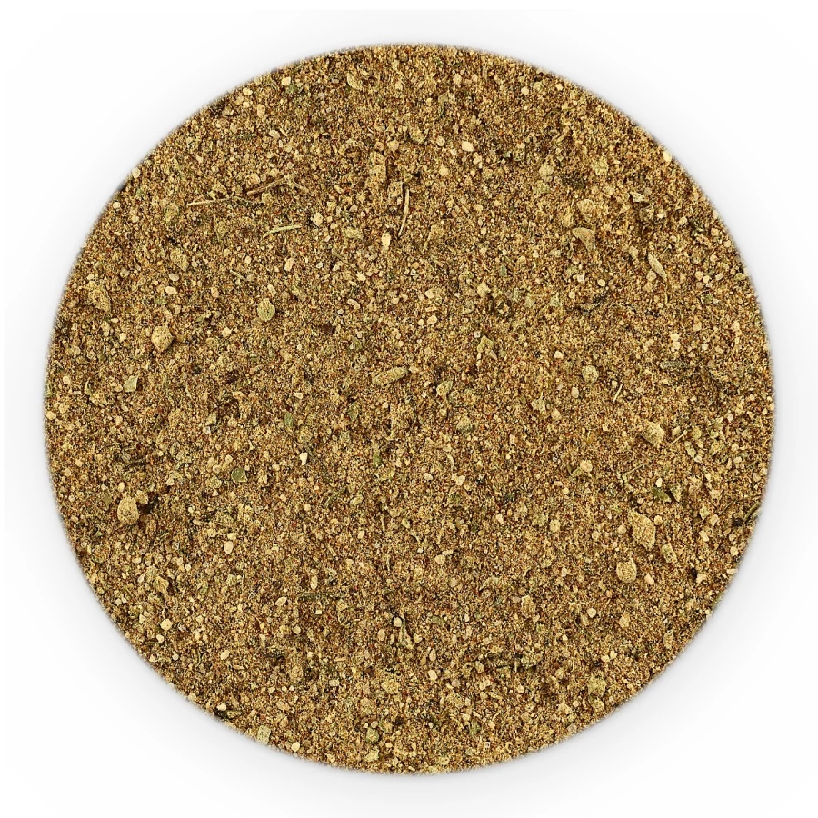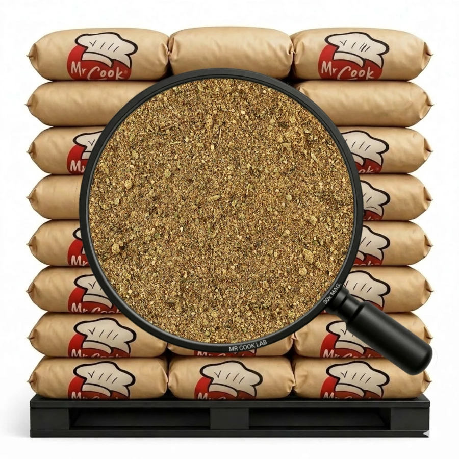 sól, czosnek, cebula, kminek, papryka słodka, kolendra, cukier, gorczyca biała, chilli, pieprz czarny, majeranek, rozmaryn, gałka muszkatołowa, cząber.