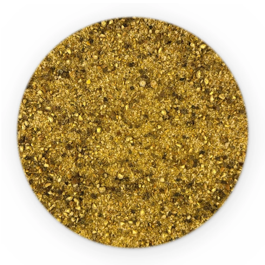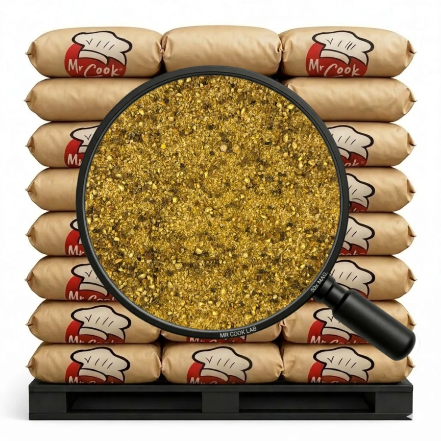 sól, pieprz czarny, wzmacniacz smaku: glutaminian monosodowy; oregano, tłuszcz palmowy, skrobia pszenna, czosnek, bazylia, kolendra, cebula, hydrolizat białka sojowego, rozmaryn, kminek, kurkuma, chilli.
